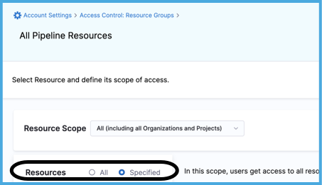 For Resource Scope, select All (including all Organizations and Projects). This means the resource group grants access to the specified resources at the account level and in all organizations and projects under the account.